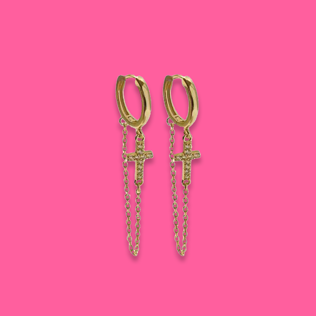 14 carat gold plated huggie with cubic zirconia cross and chain detail