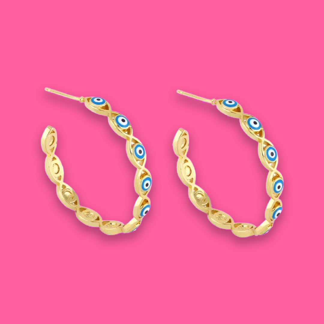14 carat gold plated hoops with evil eye design to keep the negative energy at bay.